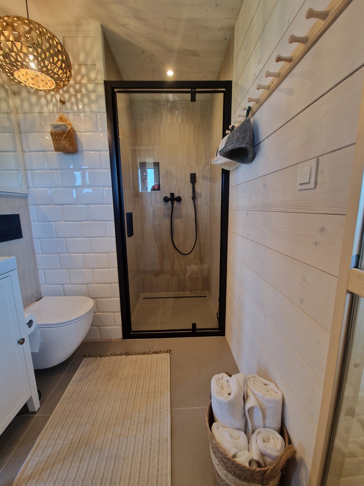 Klimatyczna łazienka z kabiną prysznicową zapewnia komfort i wygodę. Stanowi również przejście do urokliwej sauny z oknem na staw.