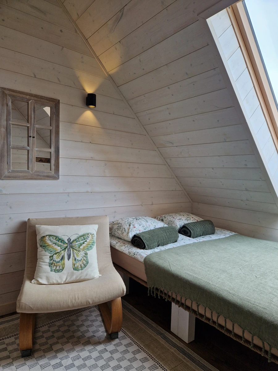 Na poddaszu przygotowaliśmy dwie 2-osobowe sypialnie z dużymi oknami dachowymi wychodzącymi na malowniczy staw, tworząc idealne miejsce do spania dla dzieci i dorosłych. Naturalne materiały i piękne wnętrza pozwolą odpocząć w zgodzie z naturą.